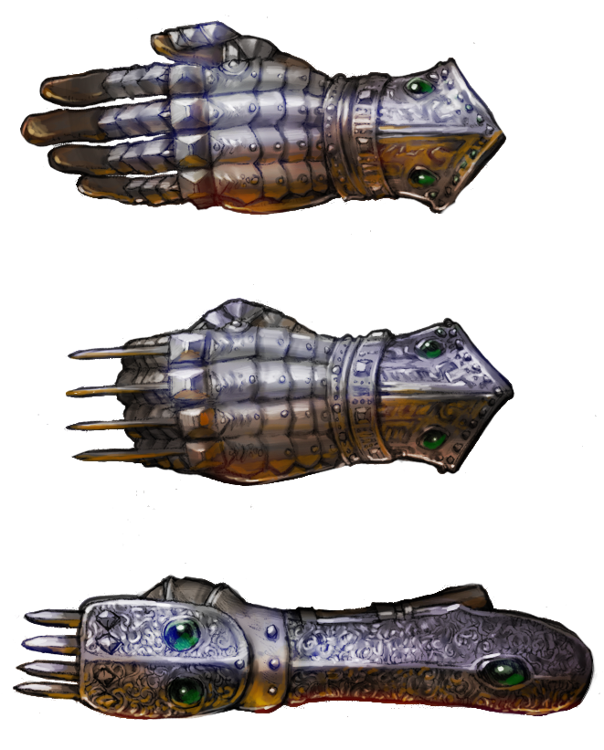 Opmerking: Om de klingen uit de veteranenhand te laten schieten, heeft men 1 vrije actie nodig, om hen weer in te trekken 2 acties. De hand, die de veteranenhand draagt, kan geen ander wapen gebruikten.